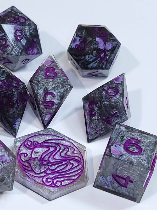 This set is a dirty pour of black white and grey resin with small stickers in shades of purple. Inked in a deep violet.