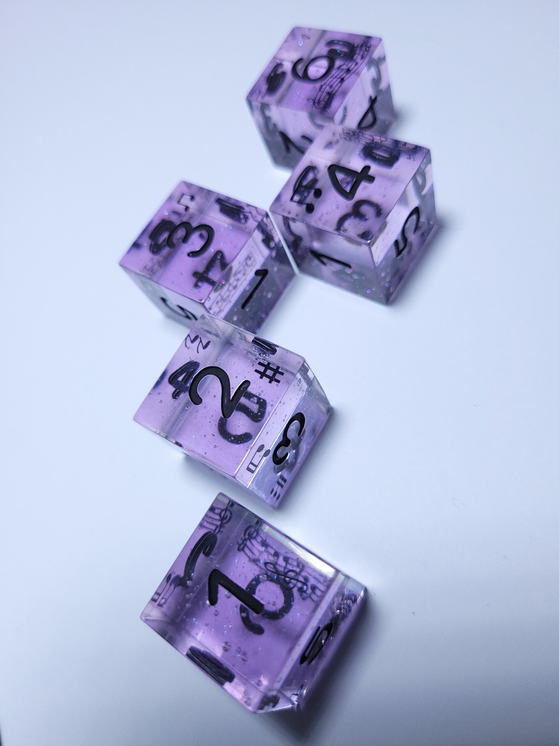 This set is a pale purple resin core with micro bubbles with music note stickers. Inked in black
