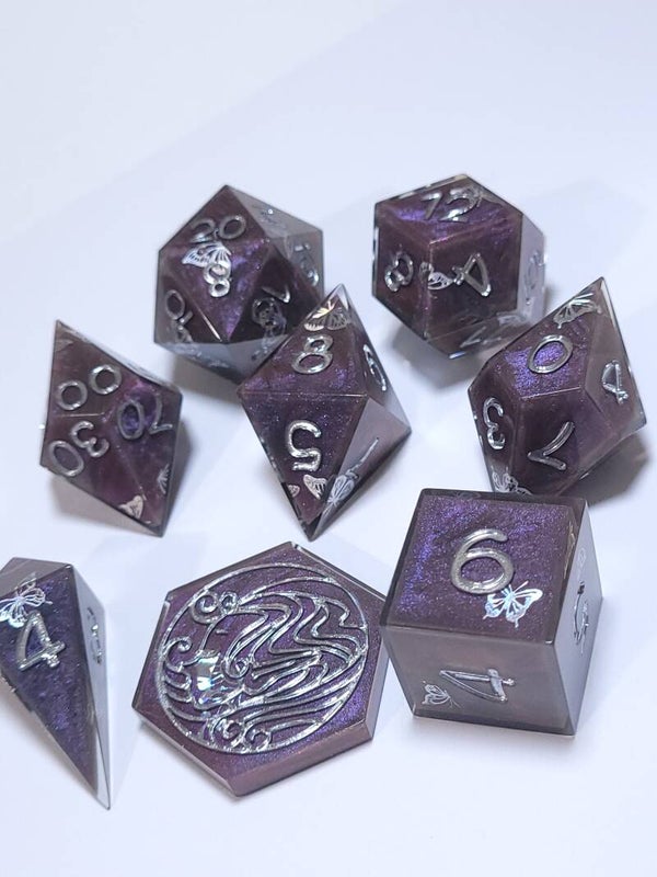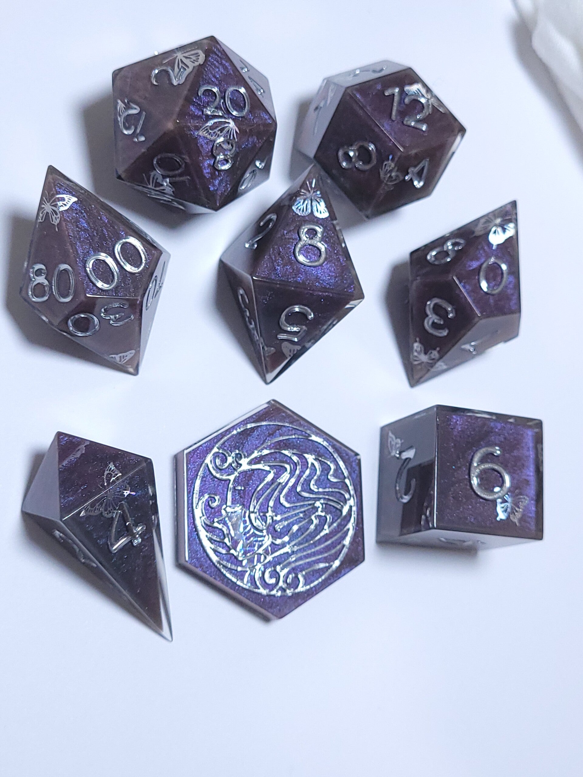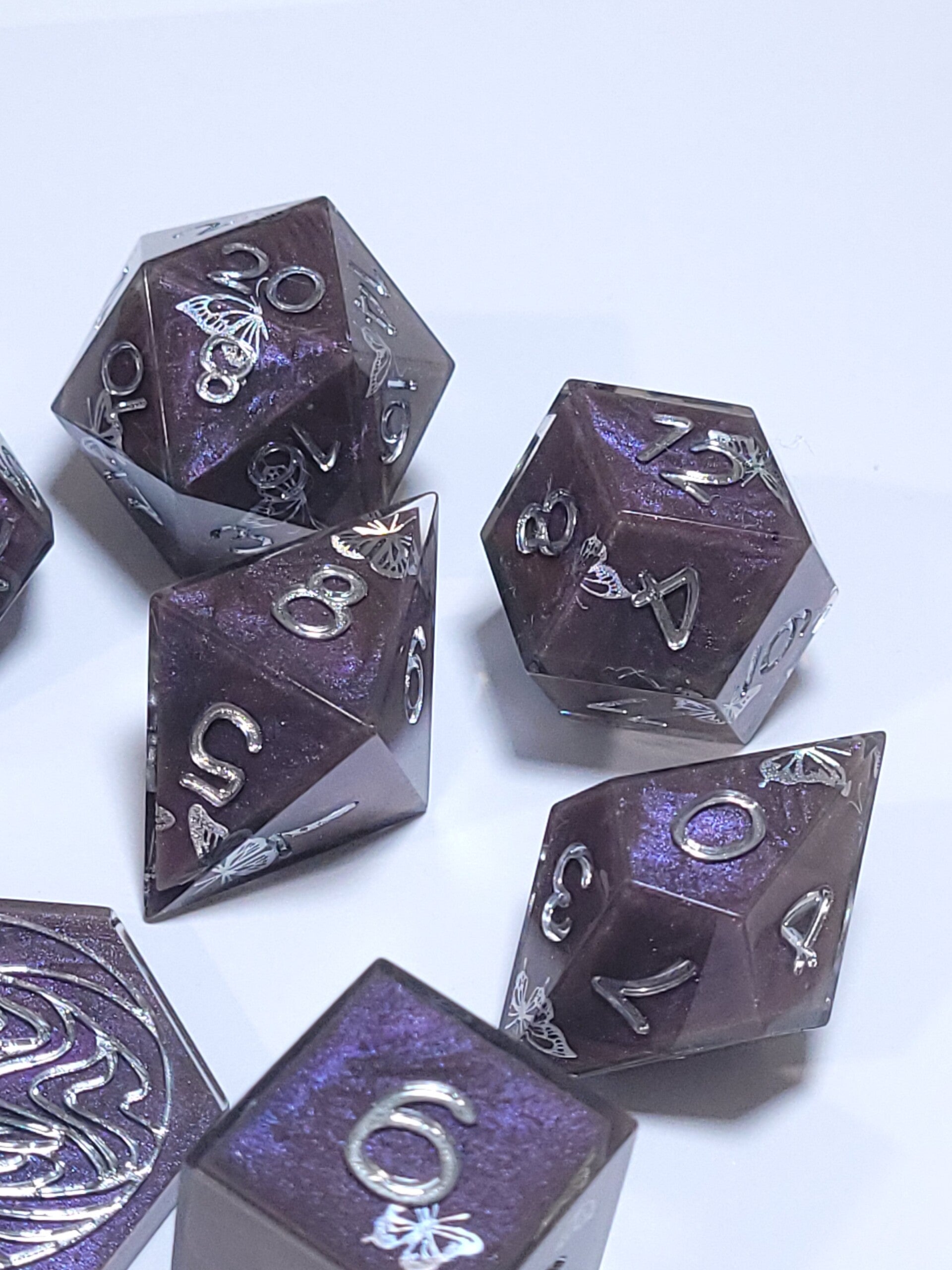 This set is a very interesting colorshift resin that kind of shifts from brown to purples and reds, with holographic butterfly stickers and Chrome inking.